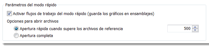 Si está activado, el modo rápido se invoca automáticamente cuando un archivo supera el tamaño configurado. Apertura completa desactiva el modo rápido y carga todos los datos del componente cada vez que se abre un layout.