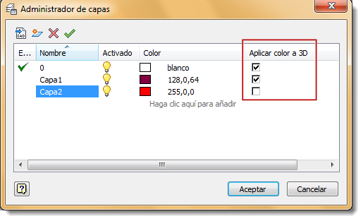 Para distinguir fácilmente los componentes por capa, seleccione la nueva opción Aplicar color a 3D en el Administrador de capas de Inventor para aplicar el color de capa a los componentes de la capa. Si esta opción se deja desactivada, se mantienen los colores originales de los componentes, independientemente del color de capa.