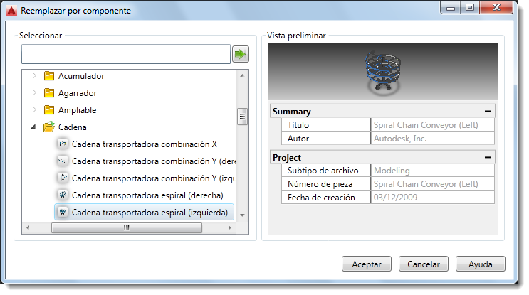 Aparece una ventana de selección de carpetas de la biblioteca de componentes. Realice una selección en una carpeta o busque un componente mediante el campo de búsqueda que se encuentra en la parte superior de la ventana. Una vista preliminar del componente seleccionado aparece a la derecha.