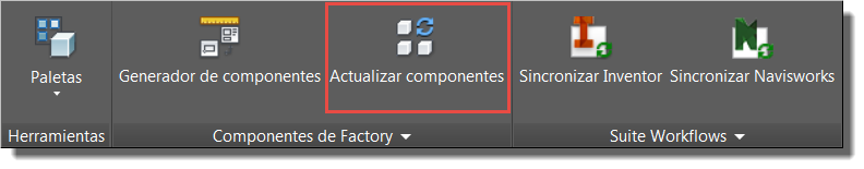 Al hacer clic en Actualizar componentes en la cinta de opciones de AutoCAD o Inventor Factory, se muestra una lista de los componentes del layout actual con las actualizaciones disponibles. Seleccione un componente para actualizarlo con las últimas definiciones; los componentes no seleccionados permanecen sin cambios.