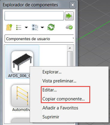 Haga clic con el botón derecho en un componente en el Explorador de componentes para visualizar un menú ampliado que incluye una opción Copiar para componentes del sistema, y las opciones Copiar y Editar para componentes de usuario.