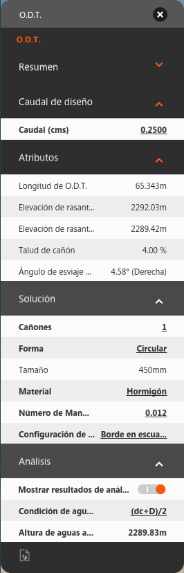 Caudal de diseño: El valor de Caudal es para O.D.T. colocadas manualmente que no tengan cerca ninguna cuenca de captación. Si la O.D.T. se encuentra en una cuenca de captación, se utiliza su valor de caudal máximo. Los valores por defecto de 7 cfs o 0.25 cm se utilizan para asignar un tamaño a una O.D.T. si no se dispone de información de caudal. Atributos: Ajuste la longitud de O.D.T. y las elevaciones invertidas mediante los gizmos y pinzamientos del modelo. Ángulo de esviaje de conducto informa del ángulo real. En la mayoría de los casos, el ángulo no debe superar el 45 %. Solución: Acceda al modo de edición para editar los valores de Solución. Haga clic en un campo para ver las opciones y edite los valores.