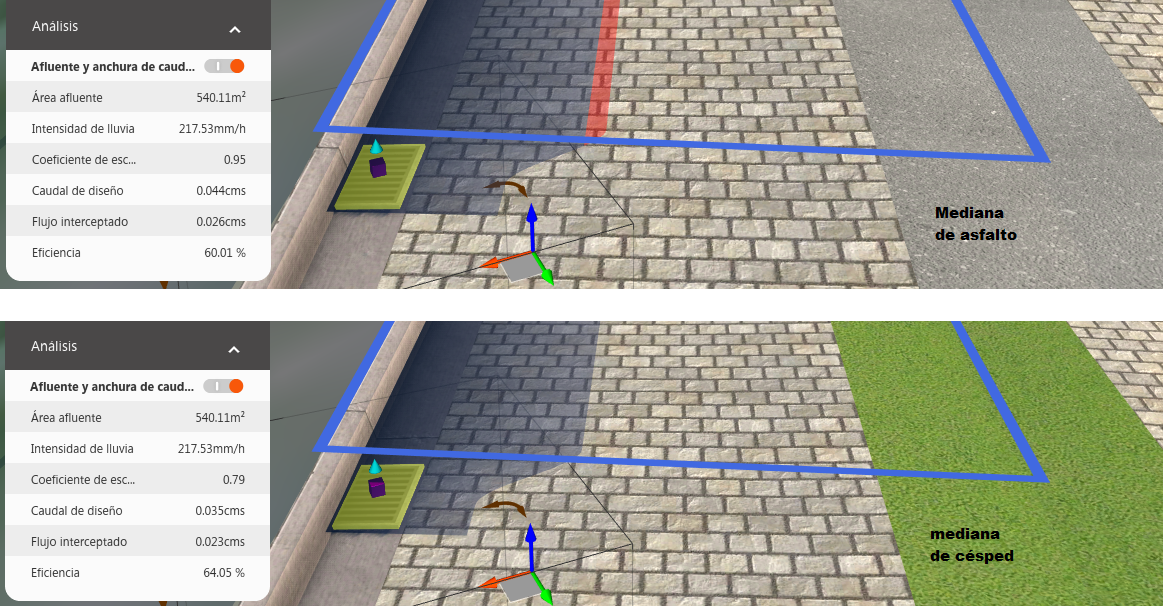 Análisis de tragantes tiene en cuenta las diferencias en coeficientes de escorrentía para las distintas clases de materiales que se utilizan en una carretera compuesta. En la comparación siguiente, los datos de análisis de las tarjetas de recursos muestran el efecto de reemplazar una mediana de asfalto por una de césped para las mismas condiciones y el mismo tragante. Observe que el valor de anchura de caudal en el caz que utiliza asfalto sobrepasa la anchura de caudal en el caz permisible recomendada (área de color rojo). En este caso, la solución es cambiar a una mediana de césped.