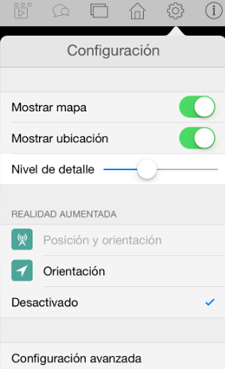 Mostrar ubicación: muestra u oculta su ubicación actual en el mapa incrustado y en el modelo. Debe estar dentro de los límites del modelo para mostrar su ubicación actual. Asegúrese de que los servicios de ubicación estén activados en la configuración del iPad. En el mapa incrustado, se indica su ubicación actual con un pequeño punto rojo. En el modelo, adopta la forma de un avatar.