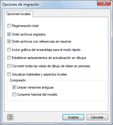 - Comprimir historial del modelo: no seleccione esta opción si va a migrar archivos a una nueva versión porque limpia el historial de recuperaciones empleado para la edición rápida de operaciones. Debe usarse solo si se trabaja con ensamblajes extremadamente grandes y experimenta limitaciones de capacidad.