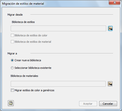 - En Migrar a, especifique la ubicación habitual del archivo InventorMaterialsLibrary.adsk o una biblioteca personalizada que cree. Por defecto, la ruta es C:\Usuarios\Acceso público\Documentos\Autodesk\Inventor 201_\Design Data\Materials en Windows 7.