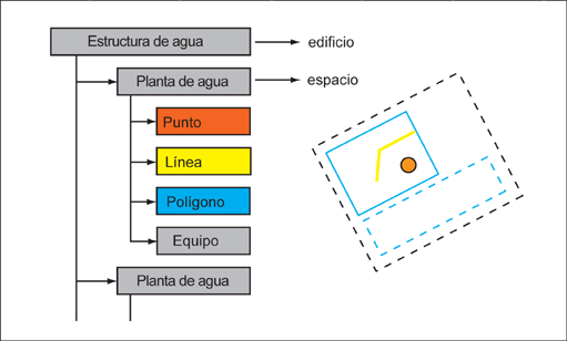 Una estructura de agua puede ser un edificio con habitaciones (plantas) que contenga equipamiento, por ejemplo, mesas y sillas. La planta tiene geometría. La estructura y el equipamiento son clases de elemento de atributo.
