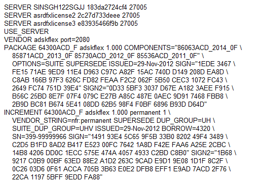 A continuación, se muestra un ejemplo de archivo de licencia de paquete completo para un modelo de servidor de licencias redundante. Las características distintivas de este tipo de archivo de licencia es la serie de tres líneas SERVER al comienzo. Una copia de este archivo de licencia se incluye en cada uno de los servidores.