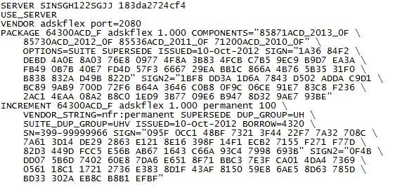 A continuación se muestra un ejemplo de un archivo de licencia de paquete completo para un modelo de servidor de licencias único o distribuido: