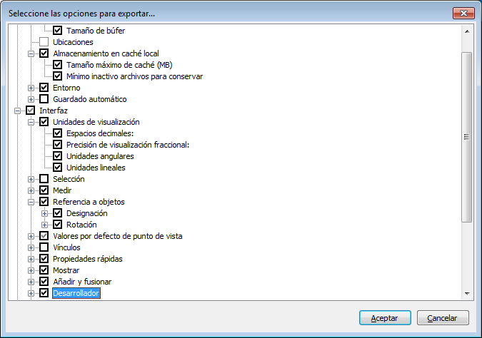 - En el cuadro de diálogo Seleccione las opciones para exportar, marque las casillas de todas las opciones que desea exportar(o "serializar"). Las opciones que aparecen atenuadas no se pueden exportar.