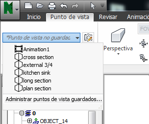 Haga clic en la ficha Punto de vista panel Guardar, cargar y reproducir menú desplegable Punto de vista actual y elija el punto de vista guardado de la lista.