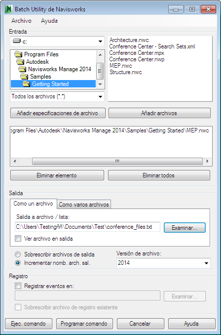 - Se abre el cuadro de diálogo Autodesk Navisworks Autodesk Navisworks y la ruta del modelo actual se añade automáticamente al área Entrada del cuadro de diálogo.