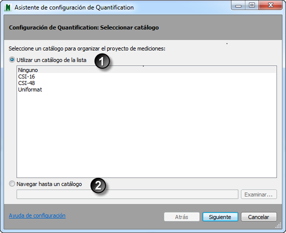 2. Navegar hasta un catálogo: active la casilla de verificación y haga clic en Examinar para utilizar un catálogo no estándar. Los catálogos deben estar en formato xml y deben contener las mismas unidades de medida y propiedades que el archivo del proyecto actual.