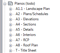 Al añadir planos a un proyecto, aparecen en una lista del Navegador de proyectos en Planos (todo).