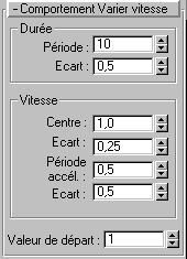 A la fin de chaque période, character studio choisit au hasard un nombre compris entre les valeurs négatives et positives du paramètre Ecart, le multiplie par la valeur du paramètre Période et ajoute le résultat à la période. Valeur par défaut = 0,5. Intervalle = de 0 à 1.