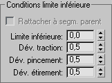 - Définissent l'effet d'atténuation à la limite inférieure de ces paramètres de tendon. Une valeur de 0 n'a aucun effet. Si vous augmentez la valeur, l'effet des paramètres Traction, Pincement ou Etirement se déplace vers le segment parent. Valeur par défaut : 0,5.