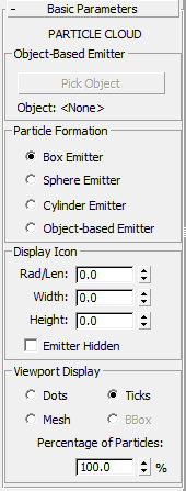 Cette section décrit les zones Emetteur basé sur l'objet, Formation particules et Afficher icône du panneau déroulant Paramètres de base, ainsi que la zone Mouvement particule du panneau déroulant Génération de particules. Ces commandes sont les seules qui soient propres à Nuage P. Les autres groupes de fonctions Nuage P sont identiques aux groupes de fonctions Réseau particules, à l'exception de Fragments objet et des paramètres connexes, qui ne sont pas disponibles dans le panneau déroulant Type de particules. Pour plus d'informations, reportez-vous à la rubrique Réseau P ou cliquez sur l'un des groupes de fonctions de la liste suivante.