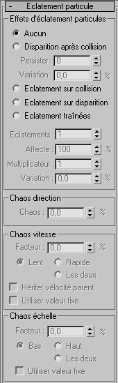 Remarque : si Multiplicateur est supérieur à 1, l'affichage des particules éclatées supplémentaires nécessite que l'un au moins des trois facteurs de Chaos soit supérieur à 0. Si tel n'est pas le cas, les particules multiples occuperont la même position.