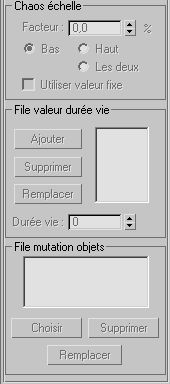 Les options incluses dans cette zone vous permettent d'attribuer une liste de valeurs de durée de vie à chaque génération de particules éclatées. Les particules éclatées se fondent sur ces durées de vie, plutôt que sur la durée de vie associée aux particules d'origine par la double flèche vie dans le panneau déroulant Génération de particules.