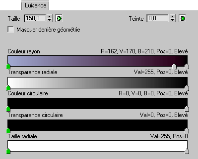 Définit la couleur de la luisance. Pour animer cette commande, cliquez sur la flèche verte. Ce paramètre peut être animé.