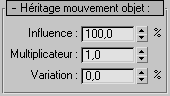 Pourcentage de particules qui héritent du mouvement de l'émetteur basé sur l'objet lors de la formation des particules. Ainsi, lorsque ce pourcentage est réglé sur 100 (valeur par défaut), les particules se déplacent avec un objet en mouvement. Lorsqu'il est réglé sur 0, les particules ne sont pas affectées par la translation de l'objet et ne suivent pas son mouvement.