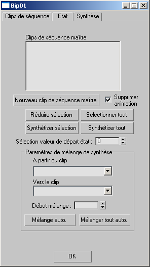 Vous pouvez indiquer explicitement le mode de mélange entre les clips ou vous pouvez laisser character studio calculer automatiquement les paramètres de mélange. Pour indiquer le mélange, utilisez les listes déroulantes pour choisir une paire de clips, puis définissez le paramètre Début mélange à l'image indiquée dans A partir du clip sur laquelle le mélange doit commencer. Sinon, utilisez les boutons Mélange auto. et Mélanger tout auto. pour que character studio détermine les meilleurs points de mélange.