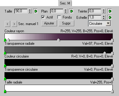 Les éléments secondaires manuels (onglet Sec. M) sont des éclats secondaires complémentaires qui sont individuellement ajoutés à l'éclat d'objectif. Ils peuvent être ajoutés aux éclats secondaires automatiques ou les remplacer.