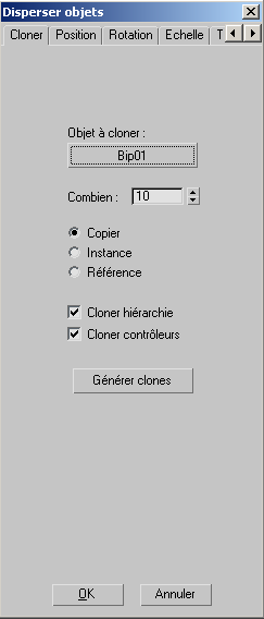 - Cliquez sur ce bouton pour créer le nombre indiqué de clones de l'objet dont le nom figure sur le bouton Objet à cloner.