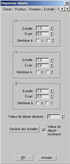Lorsque cette option est activée et que vous cliquez sur le bouton Générer des échelles, la fonction Dispersion ajoute 1 au paramètre Valeur de départ aléatoire et réexécute la mise à l'échelle des objets en appliquant cette nouvelle Valeur de départ aléatoire. Cette option est activée par défaut.