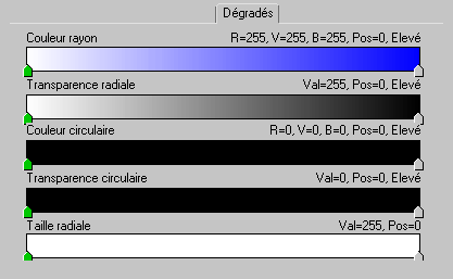Permet de charger une image bitmap et d'utiliser chaque rangée de pixels du bitmap comme un dégradé animé. Lorsque vous chargez le bitmap dans une fenêtre de dégradé, Lens Effects lit d'abord horizontalement les 100 premiers pixels de la première ligne de l'image (pour les 100 divisions de ses commandes de dégradé) et les convertit en dégradé. Pour les images suivantes, Lens Effects lit la ligne de pixels suivante comme dégradé. Lorsque vous déplacez la glissière d'animation, vous pouvez voir le dégradé varier dans le temps.