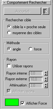 Utilisez les paramètres Rayon en option pour activer le comportement Rechercher uniquement lorsque les représentants se trouvent dans un certain rayon autour de la cible. L’intensité relative de la force passe de 0 pour cent au rayon extérieur à 100 pour cent au rayon intérieur.