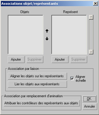 Vous pouvez utiliser cette boîte de dialogue pour associer des représentants à des objets Vous pouvez également utiliser cette boîte de dialogue pour aligner des objets sur des représentants, et éventuellement associer des facteurs d'échelle. Enfin, vous pouvez indiquer que les objets utilisent les contrôleurs des représentants.
