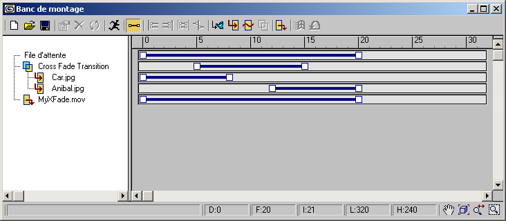 Vous souhaiterez parfois effectuer une transition entre deux vues ou deux animations. Cette procédure vous indique comment effectuer un fondu enchaîné entre deux images. Dans l'exemple, le fondu enchaîné prend place sur 20 images, l'affichage de la première image étant effectué sur 5 images, le fondu enchaîné sur 10 images et la seconde image sur les 5 dernières images.