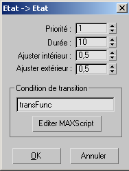 L’élément principal de la transition est le script MAXScript (qui contient des instructions conditionnelles). Ce script associé au contrôleur est exécuté une fois par image et peut tester n’importe quel aspect de la scène et effectuer une transition ou non, selon que le test est réussi (vrai/true ou 1) ou est un échec (faux/false ou 0).