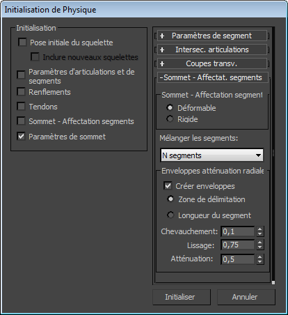 Si vous avez besoin de réinitialiser les paramètres des sommets, des enveloppes et d'autres paramètres de la peau sur un maillage Physique, cliquez sur Réinitialiser pour afficher la boîte de dialogue Initialisation de Physique. A l'aide des commandes de cette boîte de dialogue, sélectionnez la catégorie à mettre à jour et appliquez les nouveaux paramètres généraux.