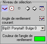 - Modifie l'angle pour le faire correspondre à l'angle d'articulation courant du squelette sur l'angle de renflement courant (affiché dans le champ Angle de renflement courant de la zone Niveau de sélection). Utilisez au préalable Mouvement ou Rotation dans une fenêtre pour modifier l'angle entre le segment sélectionné et son enfant, puis cliquez sur ce bouton.