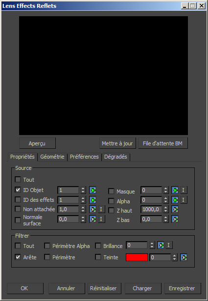 Si vous sélectionnez Lens Effects Highlight dans la boîte de dialogue Ajouter événement filtre image et que vous cliquez sur Configuration, 3ds Max ouvre la boîte de dialogue Reflet.