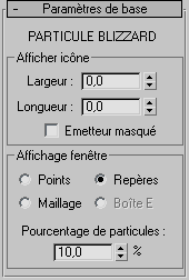 Cette section décrit la zone Afficher icône du panneau déroulant Paramètres de base, la zone Mouvement particule du panneau déroulant Génération de particules et la zone Source et mapping de matériau du panneau déroulant Type de particules. Ces commandes sont les seules qui soient propres à Blizzard. Les autres groupes de fonctions Blizzard sont identiques aux groupes de fonctions Réseau particules, à l'exception de Fragments objet et des paramètres connexes, qui ne sont pas disponibles dans le panneau déroulant Type de particules. Pour plus d'informations, reportez-vous à la rubrique Réseau P ou cliquez sur l'un des groupes de fonctions de la liste suivante.
