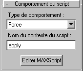 Le comportement " scripté " vous permet de créer des comportements personnalisés à l'aide de MAXScript. Un comportement " scripté " (piloté par un script) peut incorporer l'un des types de comportement suivants : Force, Contrainte ou Orientation.