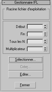 - Affiche le numéro du dernier fichier image de la séquence sélectionnée. Indiquez une valeur plus petite pour spécifier une image de fin différente pour le fichier IFL.