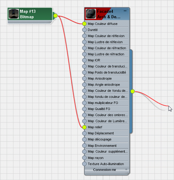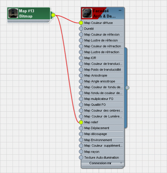 - Reliez le bitmap aux composants Texture Couleur diffuse et Texture Relief du matériau Arch & Design.