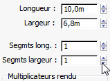 - Dans la fenêtre Face, faites glisser le curseur pour créer un plan. Remplacez la valeur du champ Longueur (hauteur) par 10,0 m et celle du champ Largeur par 6,8 m. Affectez la valeur 1 aux paramètres Segmts long. et Segmts largeur.