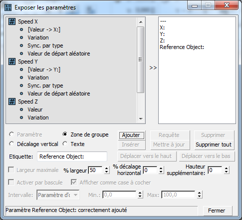 La boîte de dialogue Exposer les paramètres s'ouvre alors, où vous pouvez rassembler et identifier les paramètres à exposer. En gros, cette boîte de dialogue permet de créer l'interface utilisateur de l'opérateur.