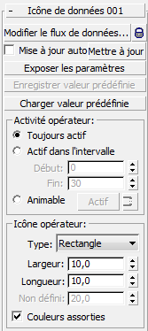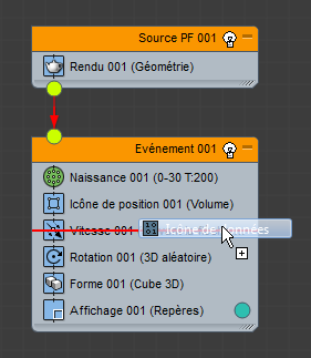 Le panneau déroulant Icône de données 001 apparaît dans la vue particule.
