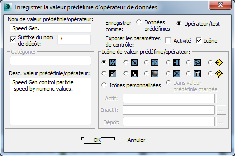 Dans le champ Desc. valeur prédéfinie/opérateur, entrez une description, par exemple : Gén. vitesse définit la vitesse des particules selon des valeurs numériques..