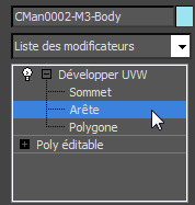 Sélectionnez le modèle CMan (nom complet : CMan0002-M3-Body). Un modificateur Développer UVW est déjà appliqué au modèle, mais il n'est pas encore entièrement configuré. Pour vous faciliter la tâche, celui-ci inclut des jeux de sélections de sous-objets Polygone.