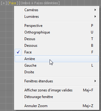 (Bascule Agrandissement vue) pour passer à une disposition à quatre fenêtres. Activez la fenêtre Face, cliquez sur le menu Etiquette Point de vue dans fenêtre et choisissez Arrière, puis appuyez à nouveau sur Alt+W.