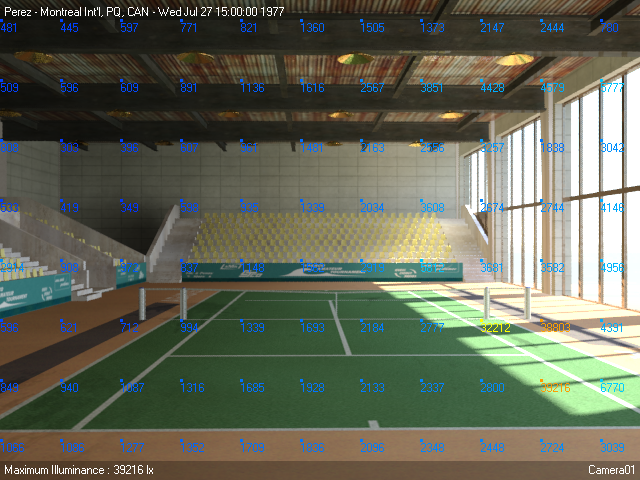 Maintenant, seules les valeurs de luminance renvoyées par les points d'échantillonnage du photomètre que vous avez créés pour la surface du court sont affichées.