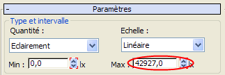 groupe Type et intervalle, changez la valeur Max à 42927.0, puis appuyez sur Entrée. (Si le rendu présente une valeur d'éclairement maximal plus levée, choisissez une valeur Max supérieure d'environ 10 points à la valeur que vous voyez.)