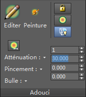 Lorsque l'option Sélection adoucie est activée, 3ds Max affiche les commandes de sélection adoucie dans un groupe de fonctions temporaire nommé "Adouci" à droite des commandes existantes du ruban. S'il n'y a pas suffisamment d'espace sur le ruban pour afficher toutes les commandes, seul le titre du groupe de fonctions s'affiche. Vous devez alors cliquer sur le groupe de fonctions pour afficher ses commandes.